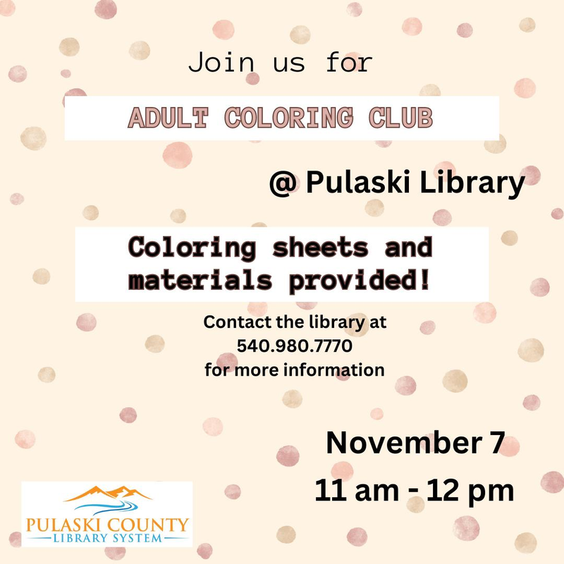 The Pulaski County Library presents Adult Coloring Club on Thursday, October 3, 2024.