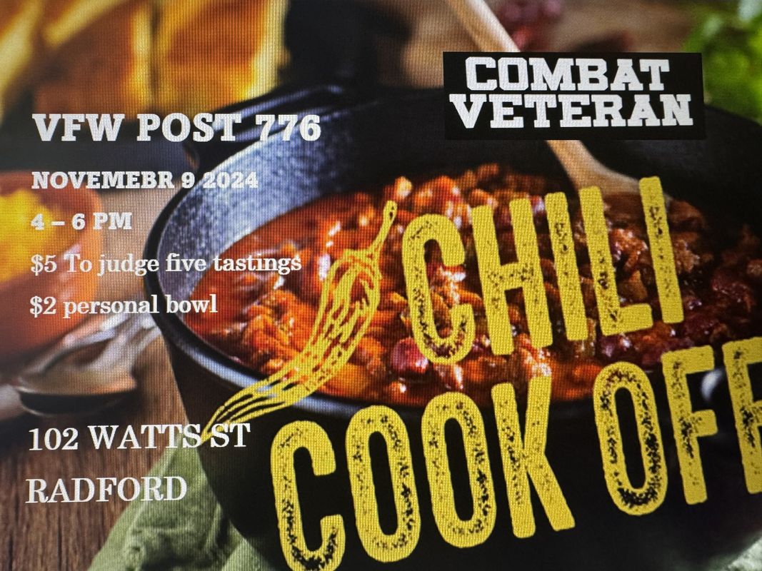 VFW Post 776 in Radford, VA presents a Chili Cook Off on Saturday, November 9, 2024.