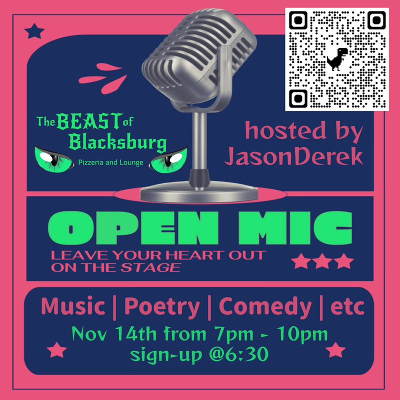 The Beast of Blacksburg Pizzeria & Bar presents an Open Mic Night on Thursday, November 14, 2024.