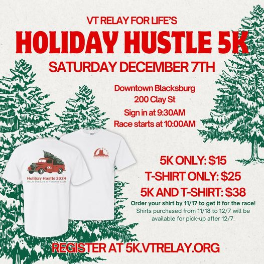 Virginia Tech Relay For Life presents their annual Holiday Hustle 5k on Saturday, December 7, 2024 starting and ending at 200 Clay Street in downtown Blacksburg, VA.