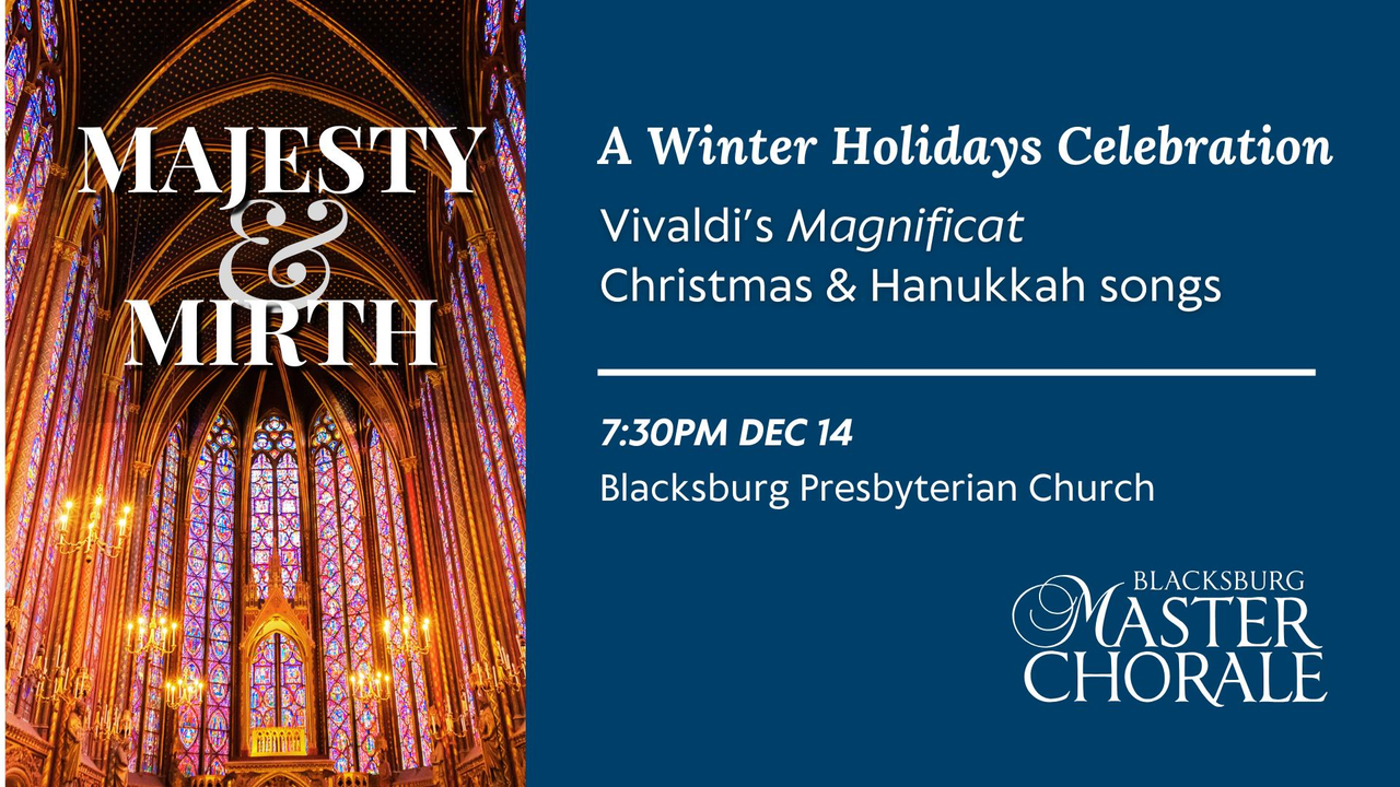 Blacksburg Master Chorale presents "Majesty & Mirth: A Winter Holidays Celebration" on Saturday, December 14, 2024 at Blacksburg Presbyterian Church.