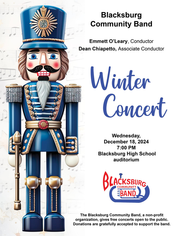 Blacksburg Community Band presents their Annual Winter Concert on Wednesday, December 18, 2024 inside the Blacksburg High School Auditorium.