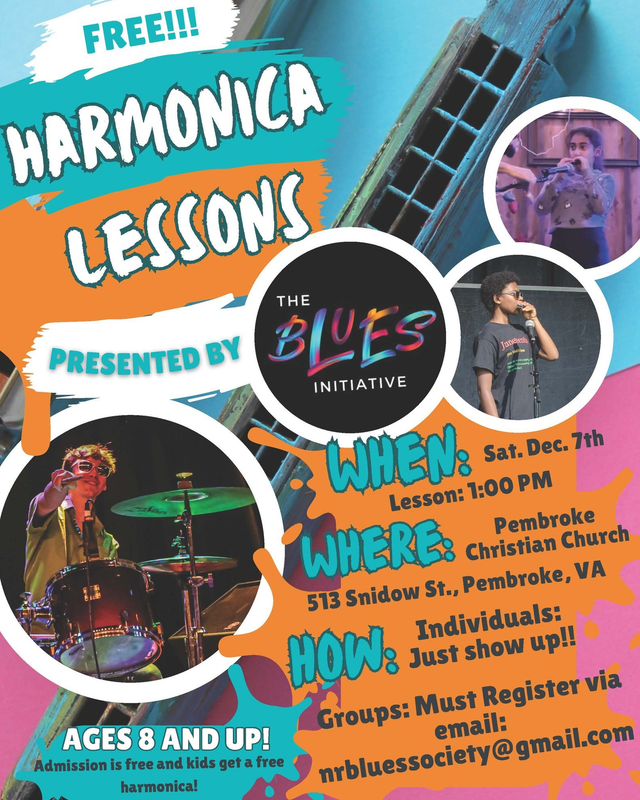 Come and join the New River Blues Society at the Pembroke Christian Church for an hour, or so, of harmonica lessons and a great time. You will be given a free harmonica and a lot of good tips for a good time jam session.