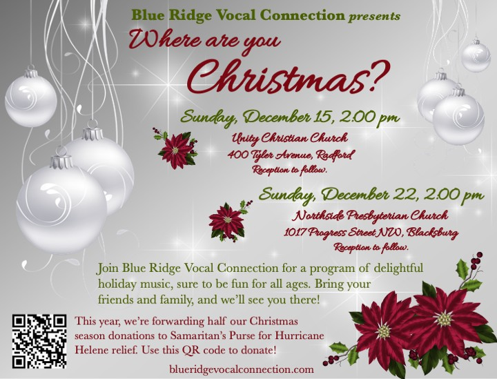 Blue Ridge Vocal Connection presents their concert "Where Are You Christmas?" on Sunday, December 15, 2024 at the Unity Christian Church of Radford.