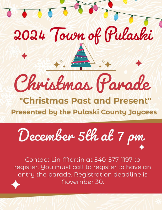 The Town of Pulaski and the Pulaski County Jaycees present the 2024 Christmas Parade on Thursday, December 5, 2024 in downtown Pulaski, VA.