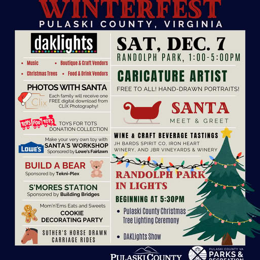 Pulaski County Tourism presents the 4th Annual Winterfest on Saturday, December 7, 2024 at Randolph Park.