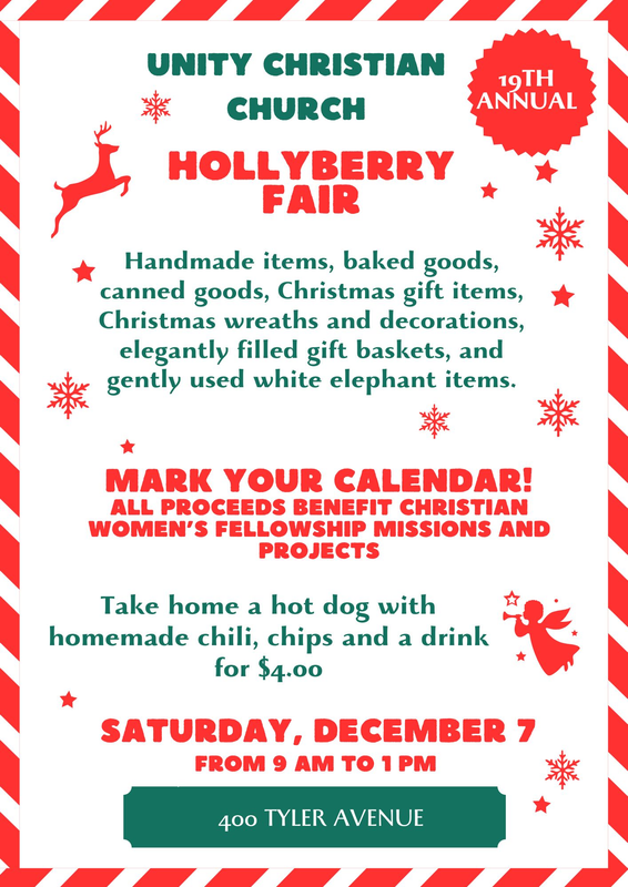 All proceeds will benefit the Unity Christian Church Christian Women's Fellowship Missions and Projects to be used to support local benefit groups and those in need.