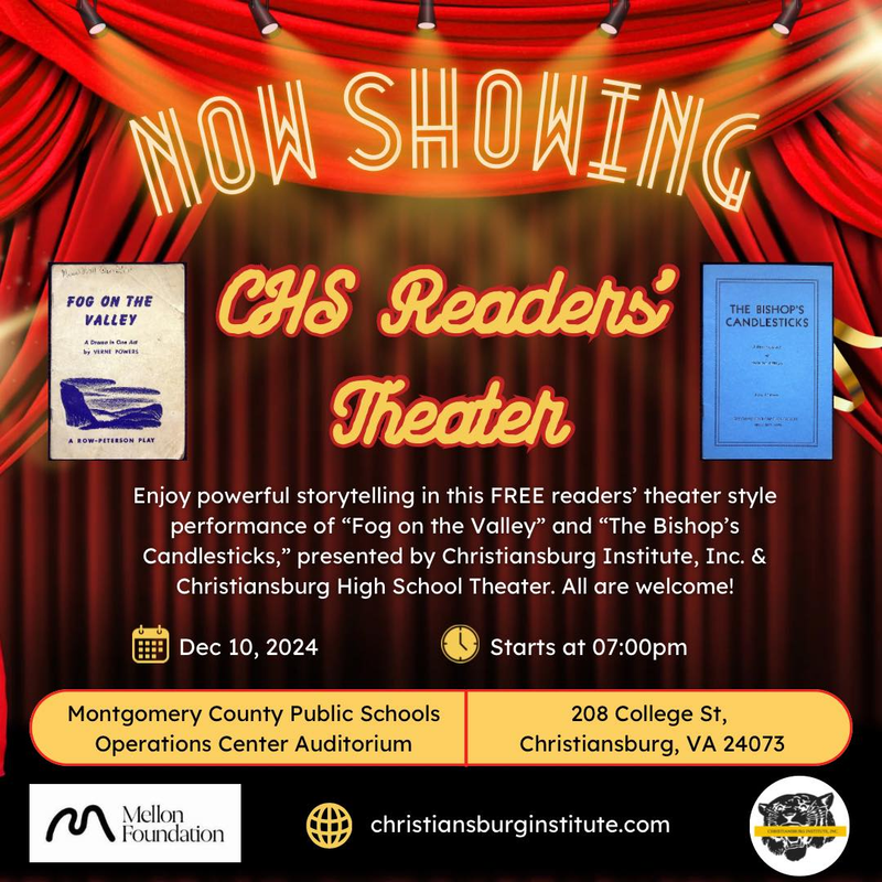 Christiansburg High School is partnering with Christiansburg Institute, Inc. to bring history to life with a Readers’ Theater performance of two, one-act plays from the Viola Charlton Collection titled “Fog on the Valley” and “The Bishop’s Candlesticks.”