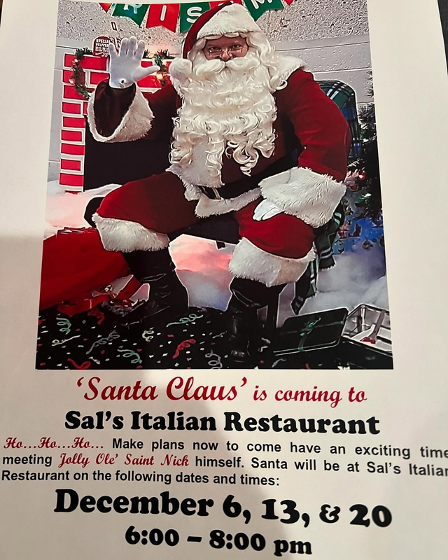Sal's Italian Restaurant And Pizza presents a Santa Claus Dinner Visit on Friday, December 13, 2024.