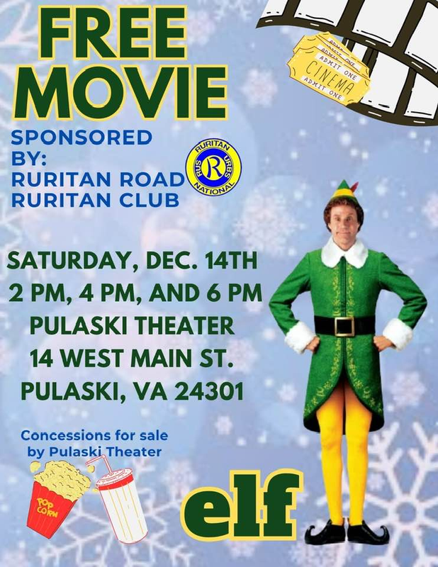The Ruritan Road Ruritan Club presents the free movie "Elf" on Saturday, December 14, 2024 at the Pulaski Theatre with three showtimes at 2:00 PM, 4:00 PM and 6:00 PM.