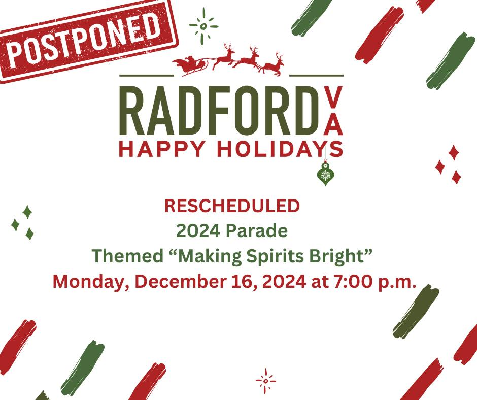 The City of Radford presents their 2024 City of Radford Holiday Parade with the theme "Making Spirits Bright" on Monday, December 16, 2024.