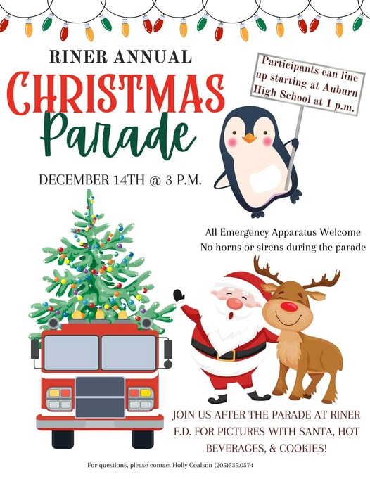 The Town of Riner presents the 2024 Riner Christmas Parade on Saturday, December 14, 2024 starting at Auburn Elementary School.