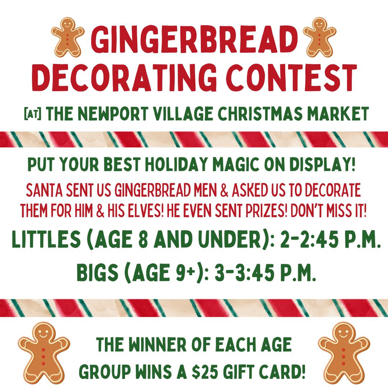 Don't miss the best little Christmas Market in Newport! The Newport Village Christmas Market is held the second Saturday in December each year and features 10+ local artisan vendors, Santa, community luncheon by donation only, compete in the Gingerbread Men Decorating Competitions, a Tree Lighting Ceremony and more.