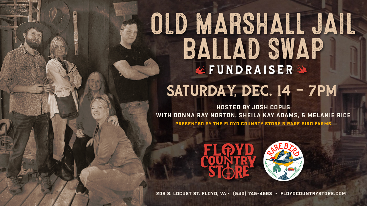 The Floyd Country Store and Rare Bird Farm presents the Old Marshall Jail Ballad Swap Fundraiser for Hurricane Helene Relief Efforts in Marshall, NC home of the Old Marshall Jail on Saturday, December 14, 2024.
