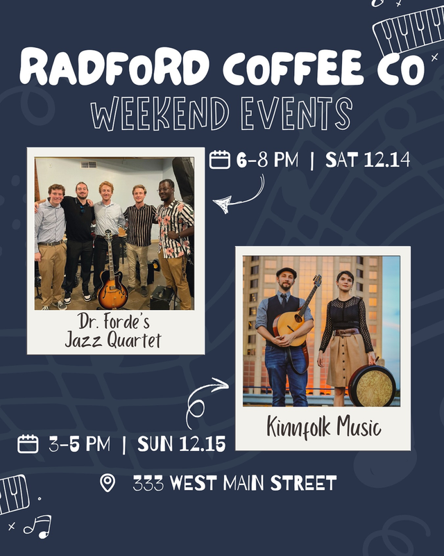 https://www.instagram.com/kinnfolk.music/The Radford Coffee Company is located at 333 West Main Street in Radford, VA.