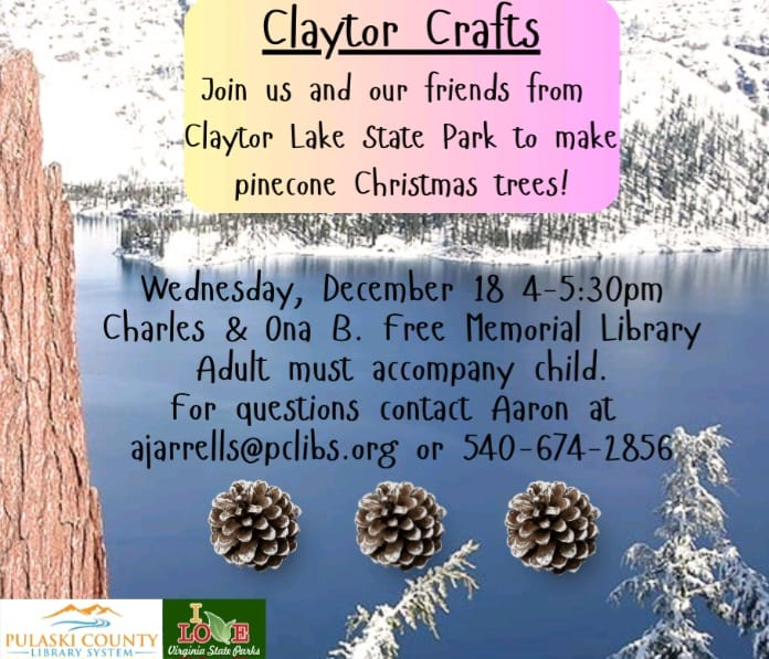 The Charles & Ona B Free Memorial Library in Dublin, VA presents "Claytor Crafts: Pinecone Christmas Trees" on Wednesday, December 18, 2024.