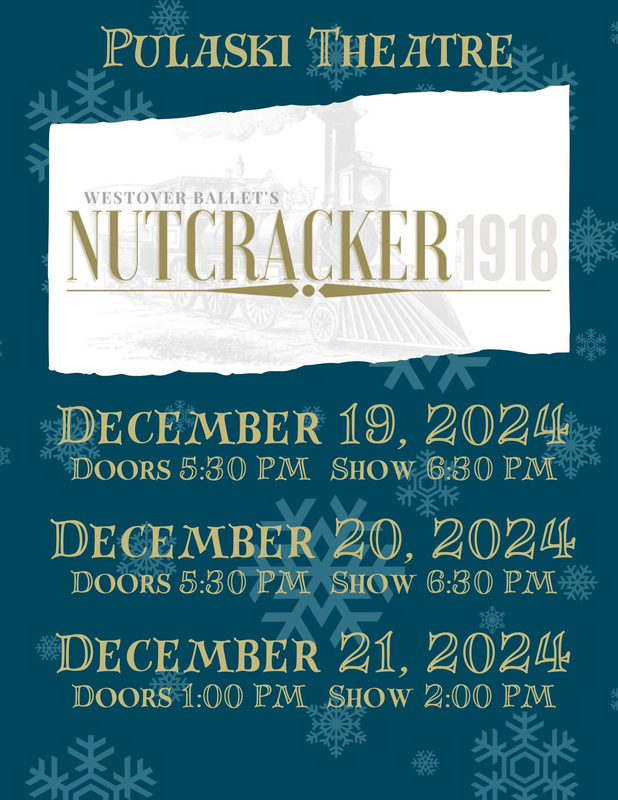 Westover Ballet presents "Nutcracker 1918" with three performances starting on Thursday, December 19, 2024 and Saturday, December 20, 2024 at 6:30 PM and on Sunday, December 21, 2024 at 2:00 PM at the Pulaski Theatre.