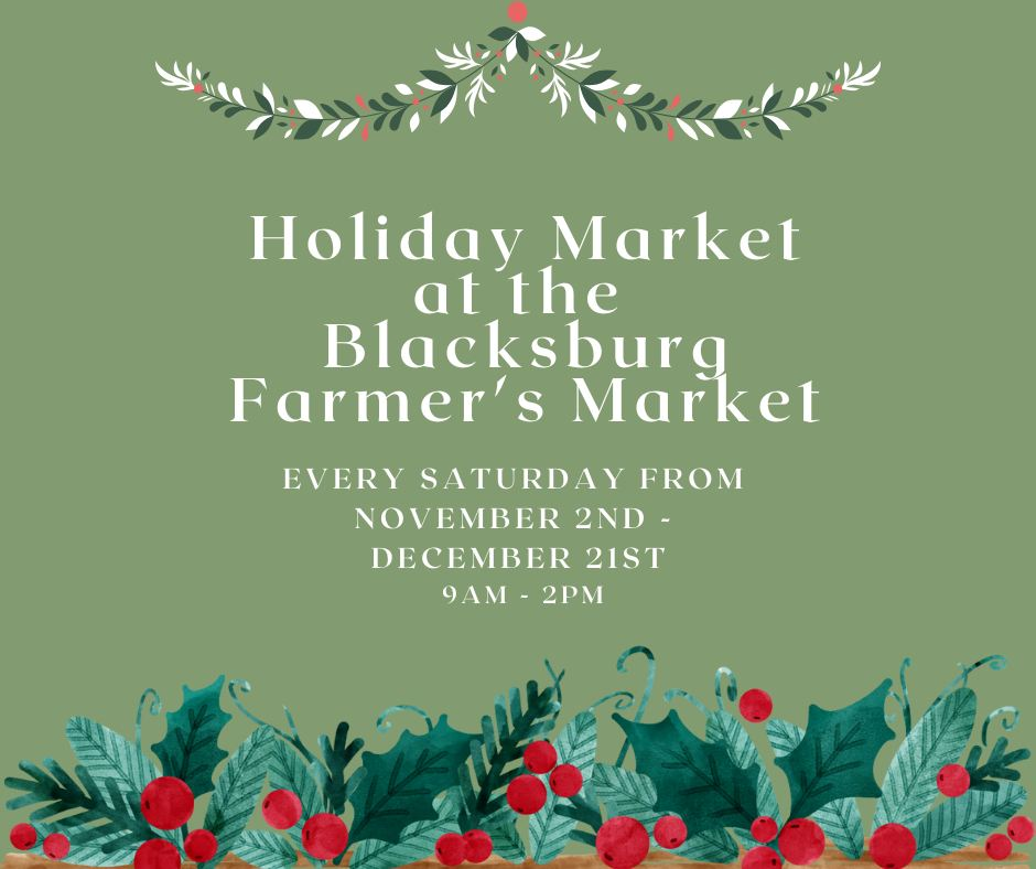 The Blacksburg Farmers Holiday Market includes crafters & artisan vendors along with the regular farmers market vendors offering local meats, organic produce, baked goods, crafts, flowers and more in the heart of downtown Blacksburg! Support your local farmers and artists and enjoy the benefits of a strengthened community, healthy living, and support for responsible business practices