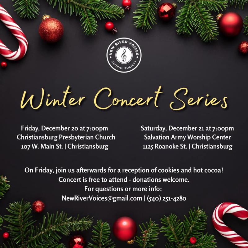 New River Voices Choral Society presents their Winter Concert Series Saturday Concert on Saturday, December 21, 2024 at the Salvation Army Worship Center in Christiansburg, VA.