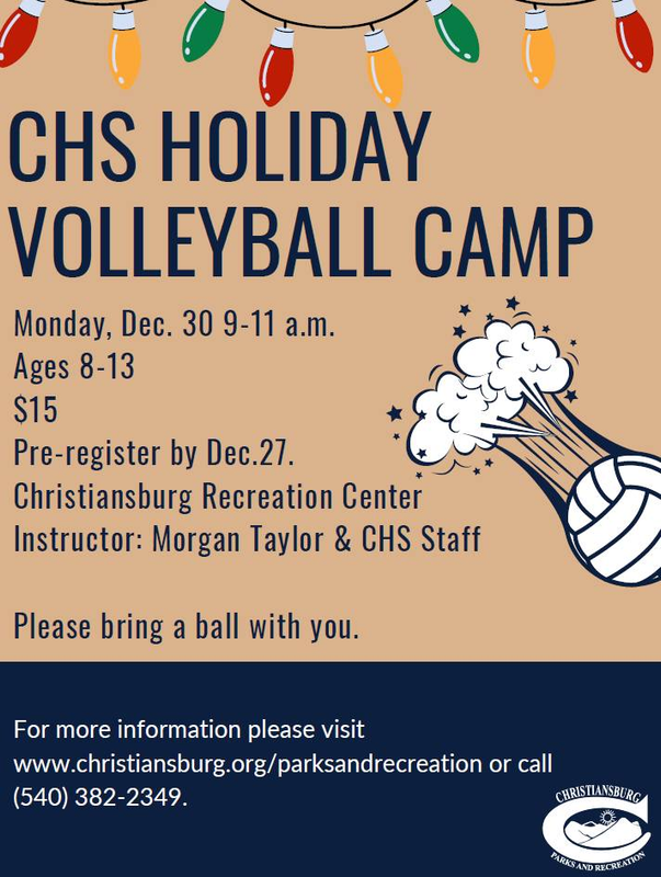 Christiansburg Recreation Center presents Christiansburg High School Holiday Volleyball Camp for ages 8-13 on Monday, December 30, 2024 with a registration deadline of Friday, December 27, 2024.
