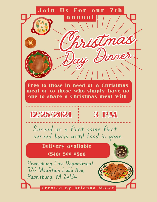 The 7th Annual Free Community Christmas Dinner will be held on Wednesday, December 25, 2024 at the Pearisburg Fire Department.