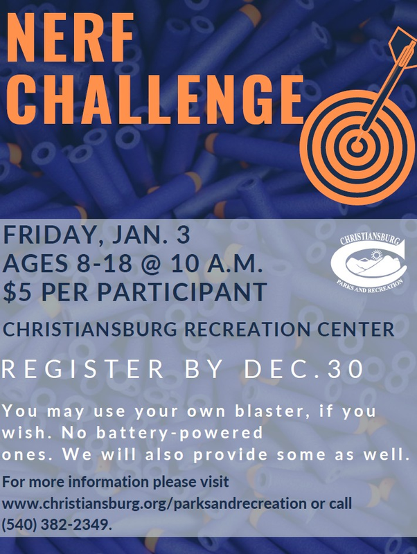 The Christiansburg Department of Parks and Recreation presents a Nerf Challenge for ages 8-18 on Friday, January 3, 2024 with a registration deadline of Monday, December 30, 2024.