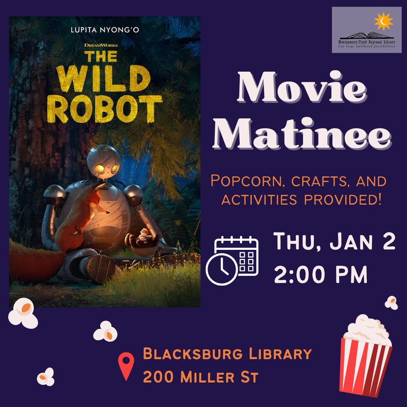 The Blacksburg Library presents a Movie Matinee featuring "The Wild Robot" on Thursday, January 2, 2025.