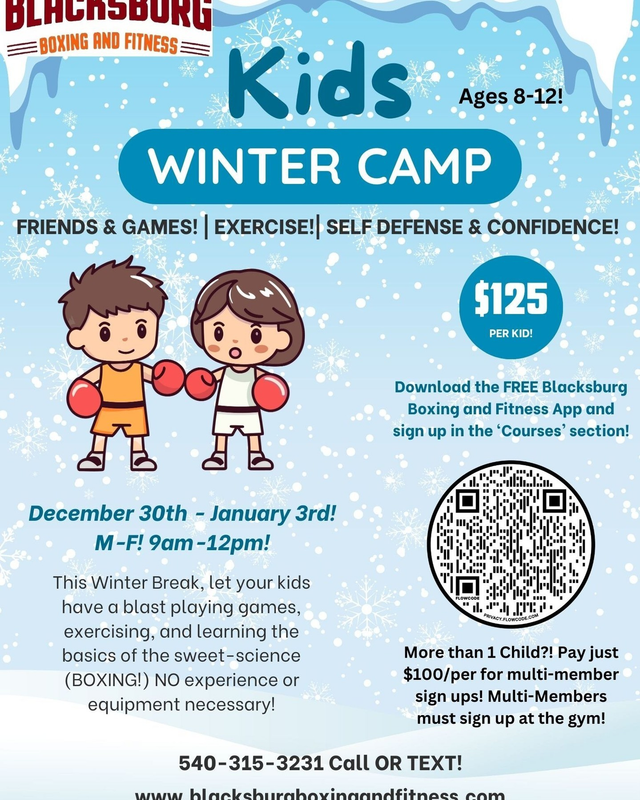 Blacksburg Boxing and Fitness presents their 5-Day Kids Winter Camp for Ages 8-12 starting on Monday, December 30, 2024 and continuing daily through January 3, 2025 from 9:00 AM to 12:00 PM.
