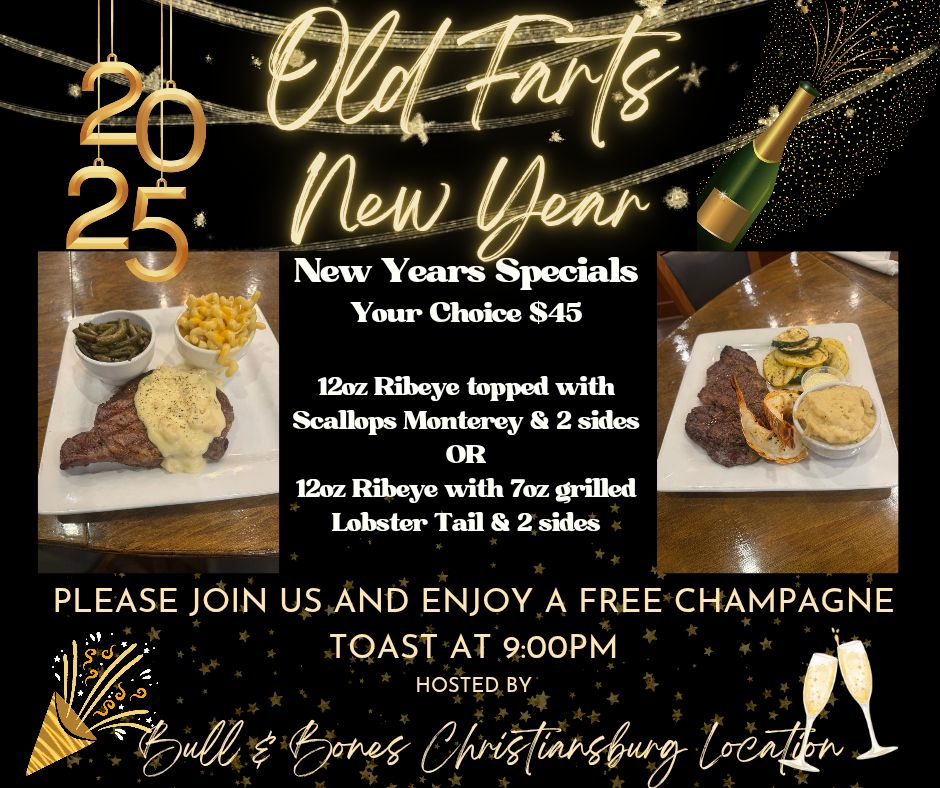 Bull & Bones Burgers, BBQ & Brewpub in Christiansburg, VA presents their Old Farts New Years Eve Dinner & Early Champagne Toast on Tuesday, December 31, 2024.