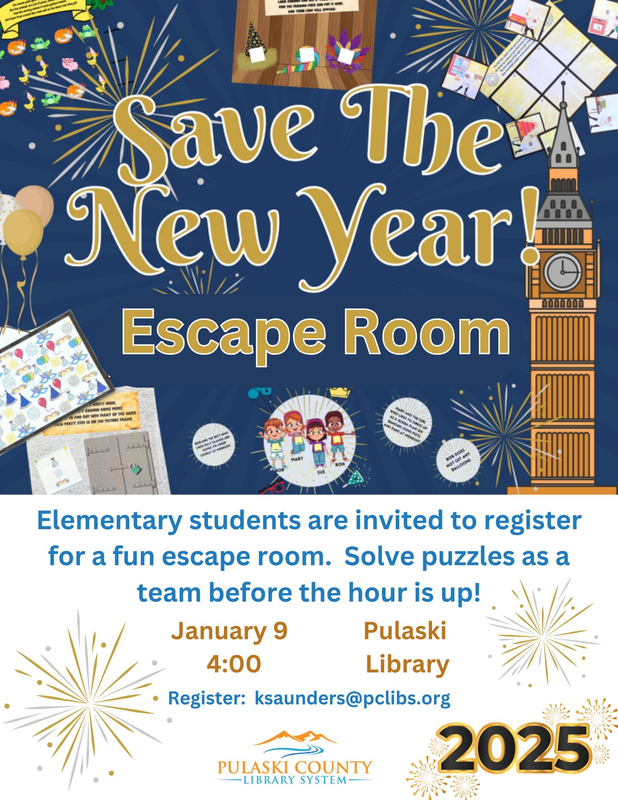 The Pulaski County Library presents Save The New Year Escape Room for Elementary Ages Kids on Thursday, January 9, 2025.