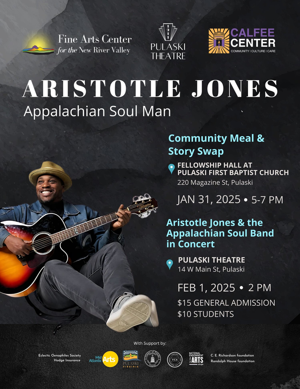 Aristotle Jones and his Appalachian Soul Band will perform as a six-band featuring horns, piano, guitar, bass, and drums at the historic Pulaski Theatre. This afternoon concert will immerse you in the powerful sounds of Appalachian Soul—a fusion of soulful rhythms, rich harmonies, and heartfelt lyrics that celebrate the diversity and depth of Appalachian culture.