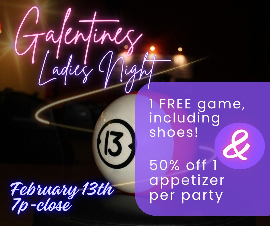 Celebrate Galentine’s Day with your favorite ladies! Enjoy one free game of bowling (shoe rental included) and 50% off one appetizer per party.