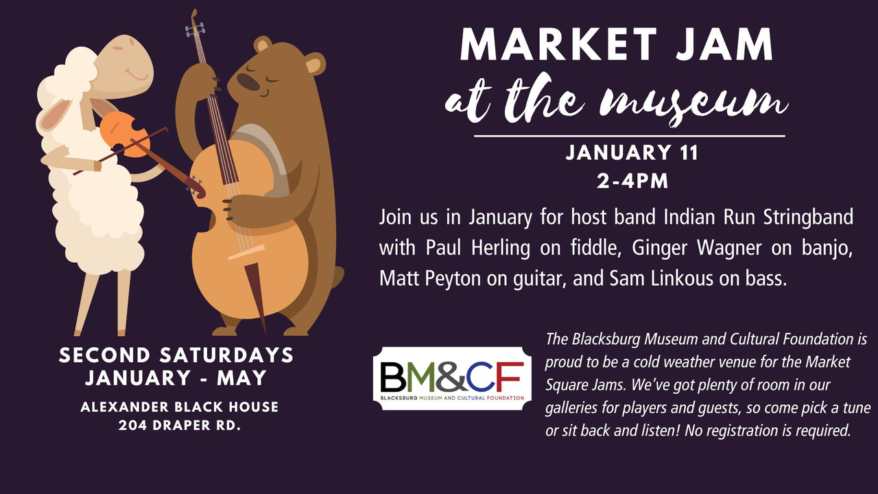 The Blacksburg Museum and Cultural Foundation kicks off their Market Jam at the Museum series with their first jam featuring host band Indian Run Stringband on Saturday, January 18, 2025 at the Alexander Black House.