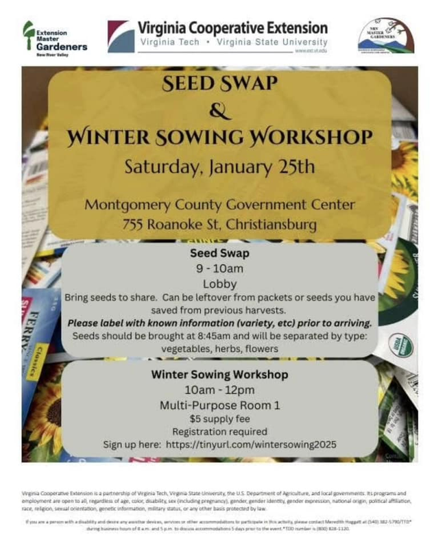 The New River Valley Master Gardeners (NRVMGA) presents their Winter Jug Sowing Workshop on Saturday, January 25, 2025 in the Montgomery County Government Center Multi-Purpose Room 1 in Christiansburg, VA.