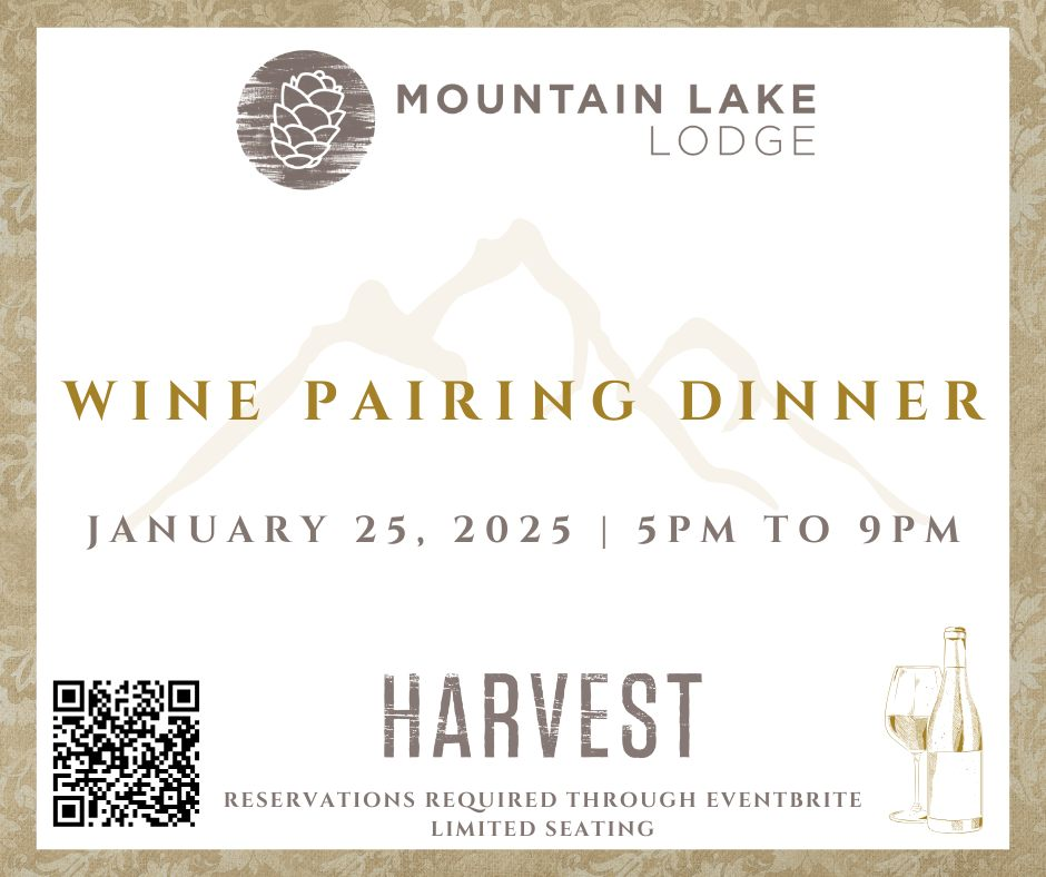 Mountain Lake Lodge presents a Wine Pairing Dinner on Saturday, January 25, 2025.