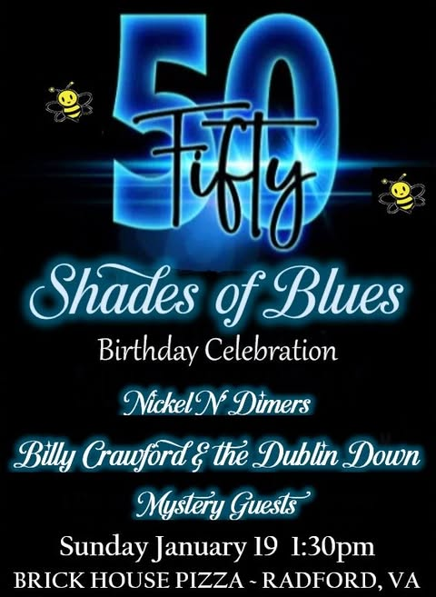 New River Blues Society hosts the 50 Shades of Blues Birthday Celebration with Nickel'n Dimers, Billy Crawford & the Dublin Down and mystery guests on Sunday, January 19, 2025 at Brick House Pizza in Radford, VA.