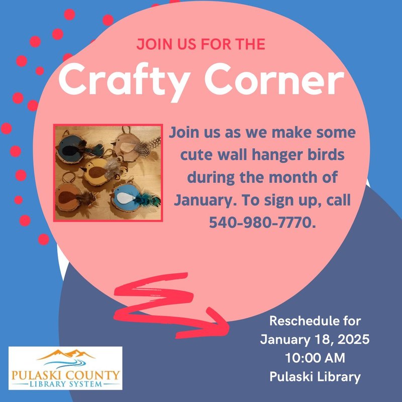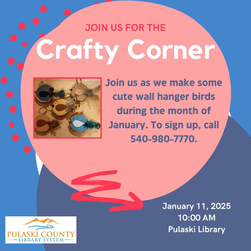 The Pulaski County Library continues the monthly The Crafty Corner series with the theme "Wall Hanger Birds" on Saturday, January 18, 2025.