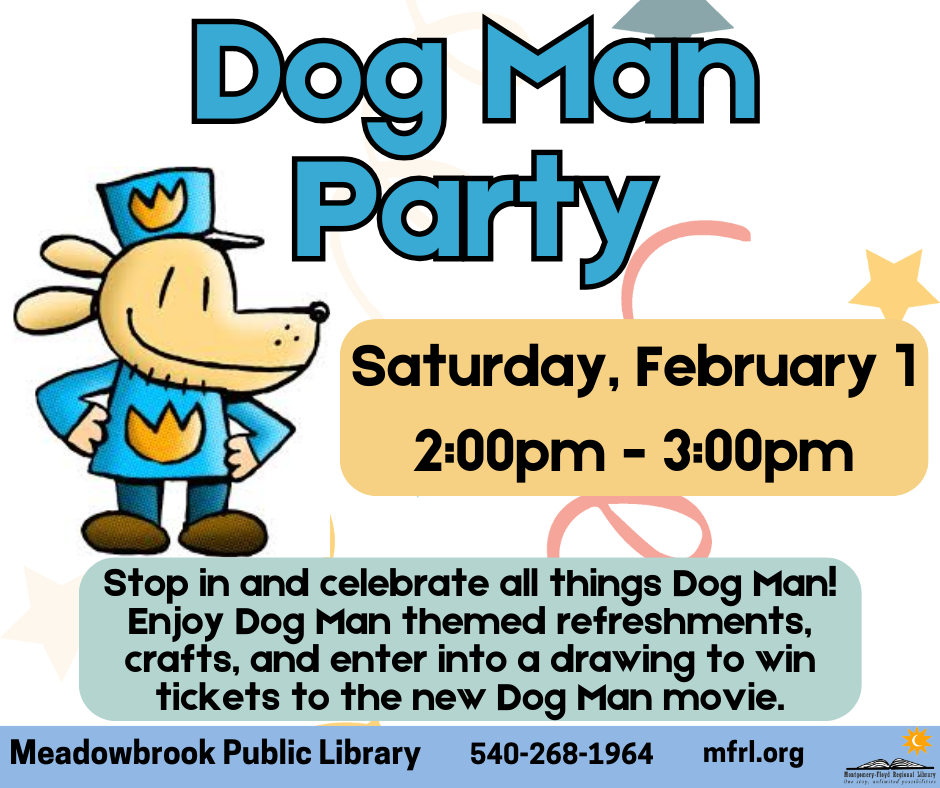 The Meadowbrook Public Library presents a Dog Man Party on Saturday, February 1, 2025.