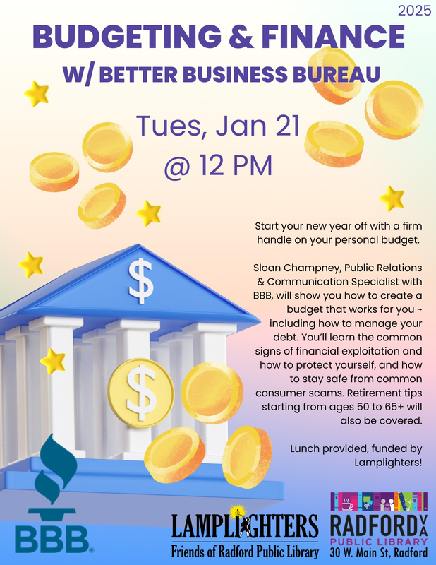 The Radford Public Library presents Budgeting & Finance with the Better Business Bureau on Tuesday, January 21, 2025.