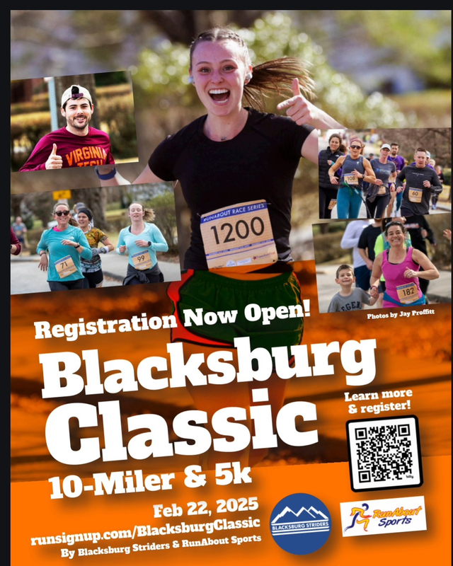 The Blacksburg Striders and Runabout Sports presents the 40th edition of the Blacksburg Classic 10 Miler & 5K on Sunday, February 23, 2025 at Margaret Beeks Elementary School in Blacksburg, VA.