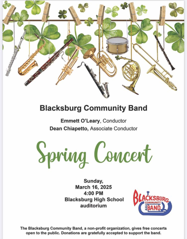 The Blacksburg Community Band is hosting their Spring Concert in the Blacksburg High School Auditorium on Sunday, March 16, 2025 starting at 4:00 PM.