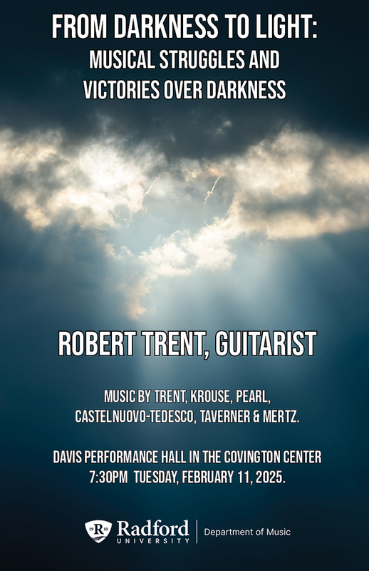 Dr. Robert Trent will present a guitar recital entitled "From Darkness to Light: Musical Struggles and Victories Over Darkness". Join us for music by Trent, Krouse, Castelnuovo-Tedesco, Taverner, Pearl and Mertz.