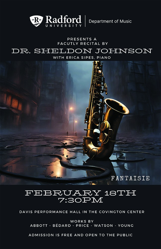 The Radford University College of Visual & Performing Arts presents a Faculty Recital with Dr. Sheldon Johnson on Saxophone on Tuesday, February 18, 2025 inside Davis Performance Hall located within the Covington Center on Radford University's main campus.