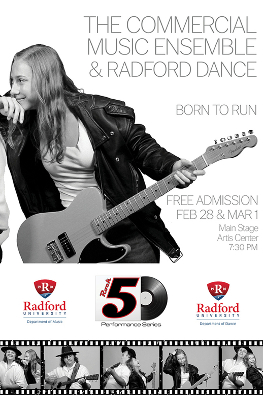 The Radford University College of Visual & Performing Arts presents thee Commercial Music Ensemble preforming "Born to Run" on Friday, February 28, 2025 and Saturday, March 1, 2025 inside the Artis Center for Adaptive Innovation and Creativity on the campus of Radford University.