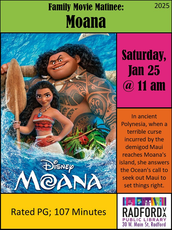 The Radford Public Library continues the Family Movie Matinee series with "Moana" on Saturday, January 25, 2025.