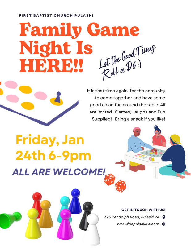 First Baptist Church Pulaski presents a Family Game Night on Friday, January 24, 2025.