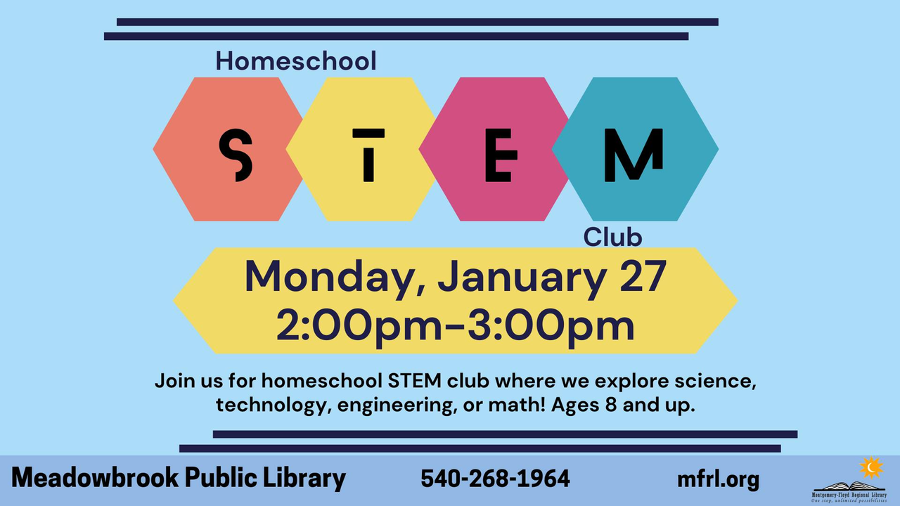 The Meadowbrook Public Library presents their Homeschool STEM Club on Monday, January 27, 2025.