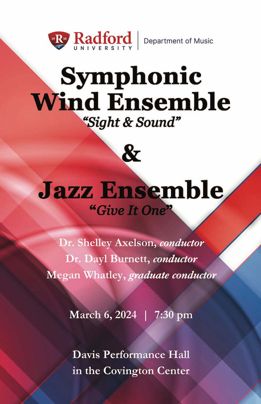 The Radford University College of Visual & Performing Arts presents Radford University Band and Jazz Ensemble Concert on Thursday, March 6, 2025 inside Davis Performance Hall located within the Covington Center on the main campus of Radford University.