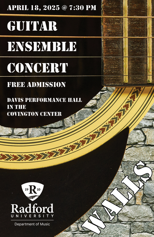 The Radford University College of Visual & Performing Arts presents Radford University Guitar Ensemble in concert on Friday, April 18, 2025 inside Performance Hall located within the Covington Center on the campus of Radford University.