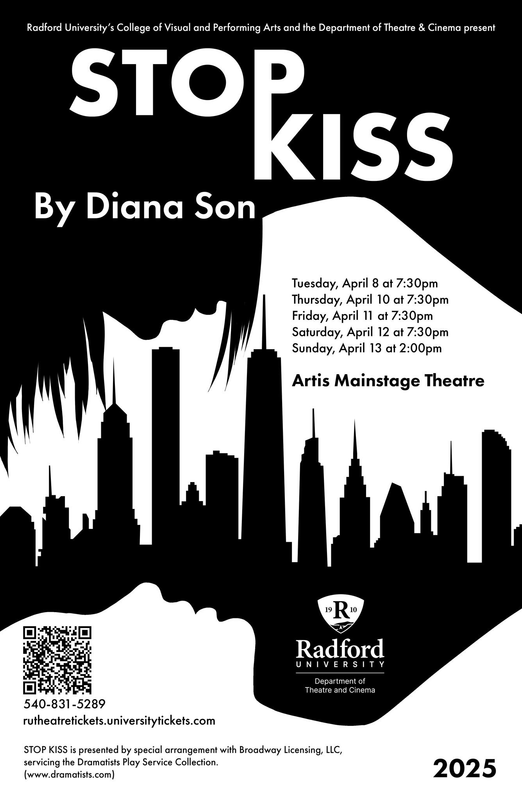 Radford University College of Visual & Performing Arts and Department of Theatre & Cinema present the play "Stop Kiss" with five performances starting on Tuesday, April 8, 2025 through Sunday, April 13, 2025 inside the Artis Center Mainstage Theatre on the campus of Radford University.